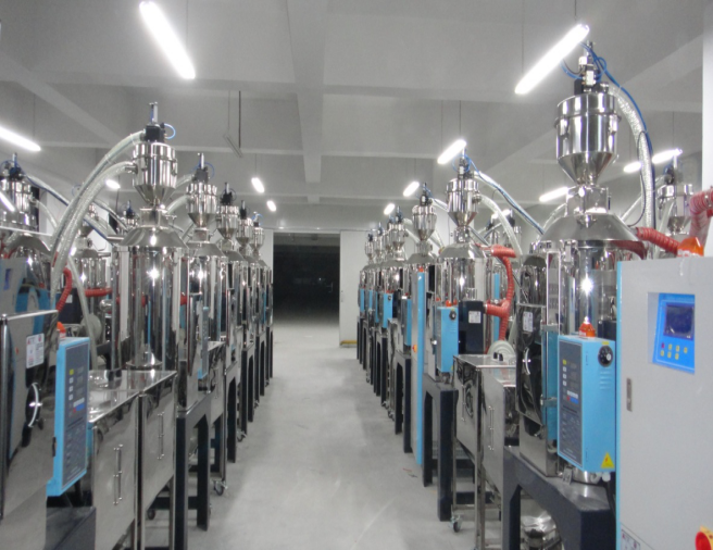 7.中央供料系統(tǒng)采用真空傳送方式,通過(guò)集中的管路系統(tǒng)將塑料原料從儲(chǔ)料罐輸送到中央除濕干燥系統(tǒng),然后將干燥后的原料輸送到每臺(tái)注塑機(jī)中。